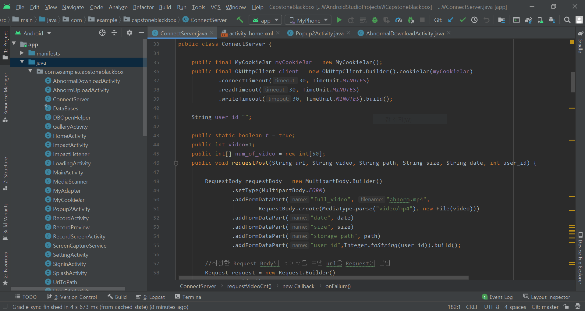 어쨋든, 받아온 uri를 절대경로로 바꾸고, 이를 현재 java파일 속 public 변수에 저장해놓는다. 그리고 완료하면 진짜 영상 업로드를 하는 activity로 이동한다. 이 activity는 AbnormalUploadActivity.java파일로 따로 만들어놨고 별건없고 그냥 액티비티가 onCreate되자마자 서버의 requestPost() 함수를 호출한다. 그러므로 이 java파일에 대한 설명은 생략하고, requestPost() 함수 설명으로 넘어가겠다.
