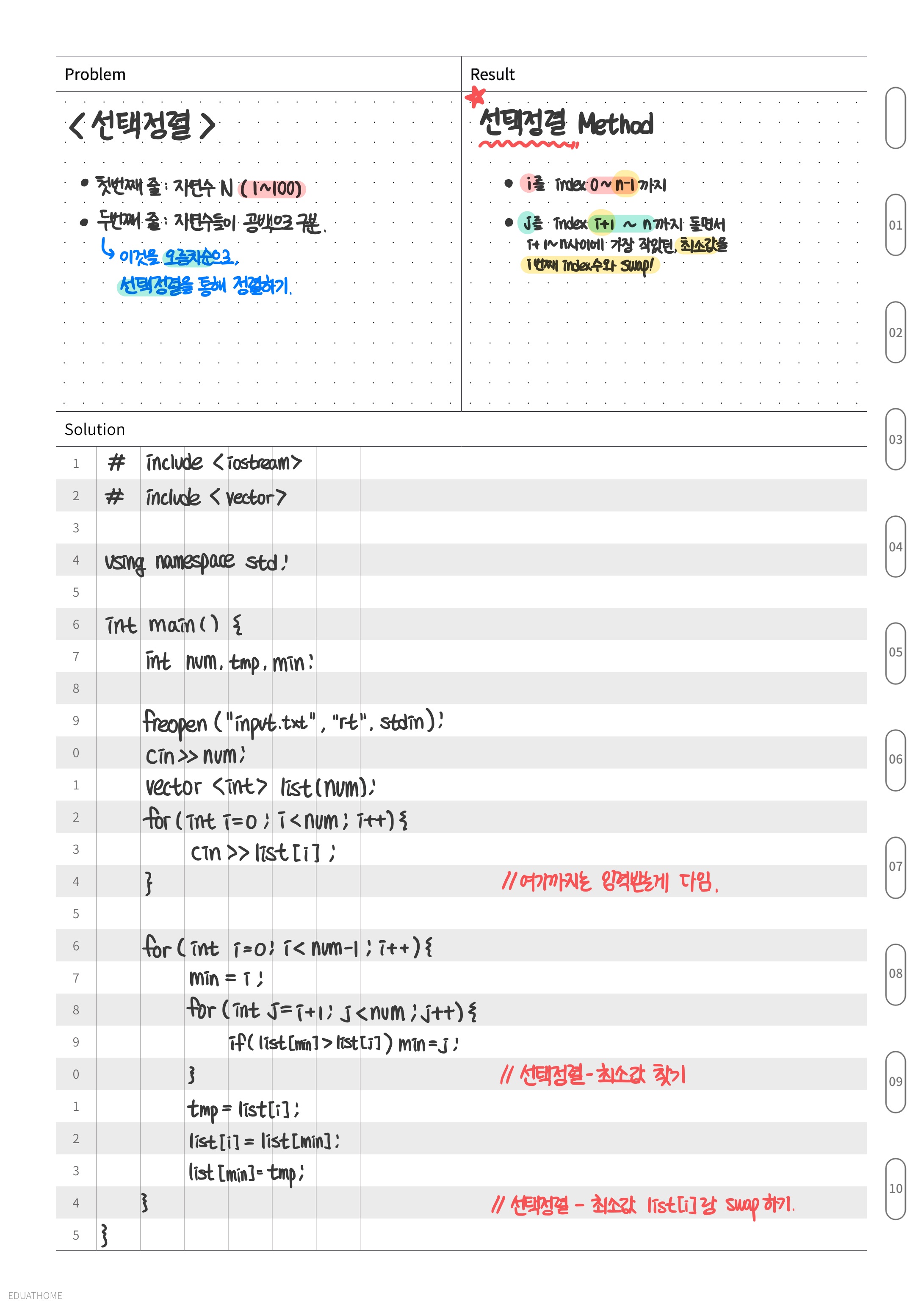 흔한 선택정렬 코드이다. c++에 맞춰서 iostream과 vector를 사용하였다.