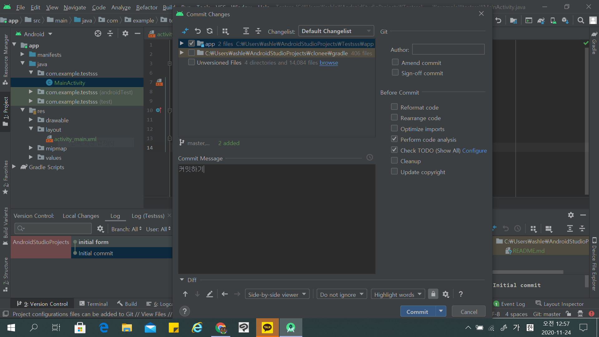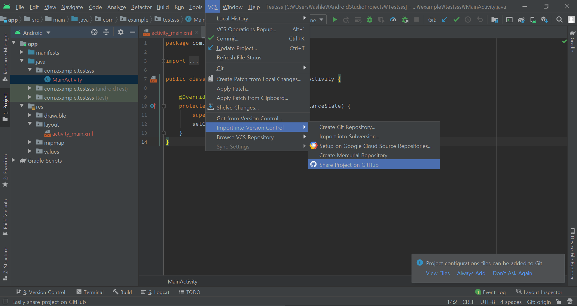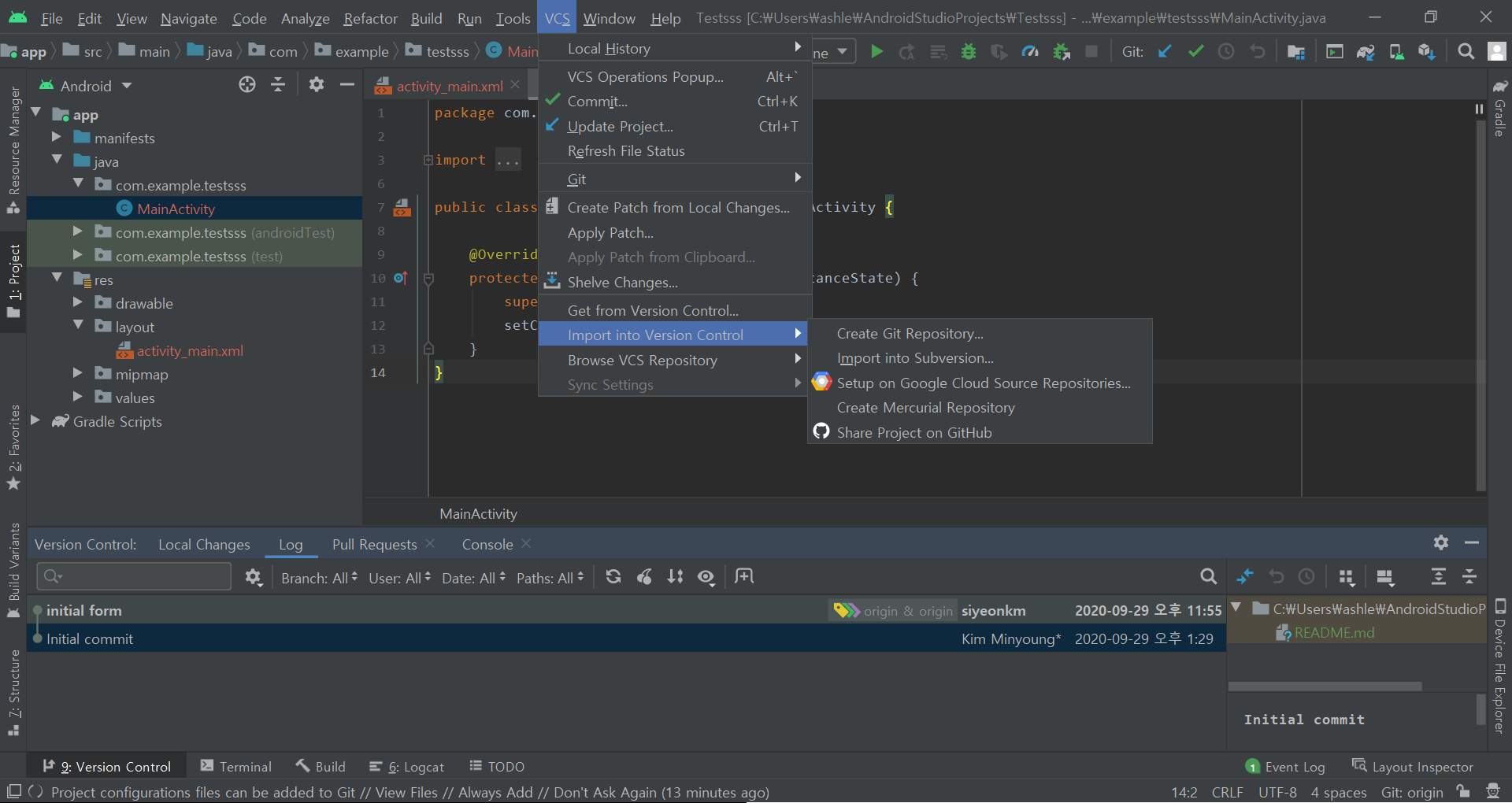 첫시작은 역시 안드로이드에서 새프로젝트를 만들고 이를 깃허브에 올려놓는 방법으로 시작하려고한다.