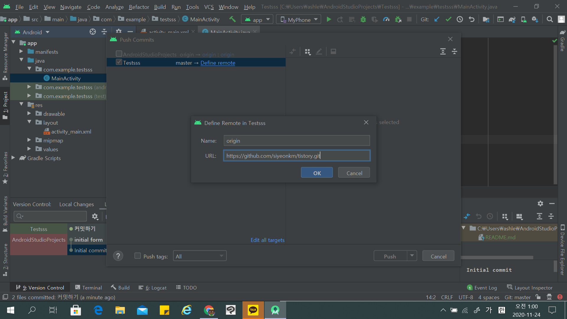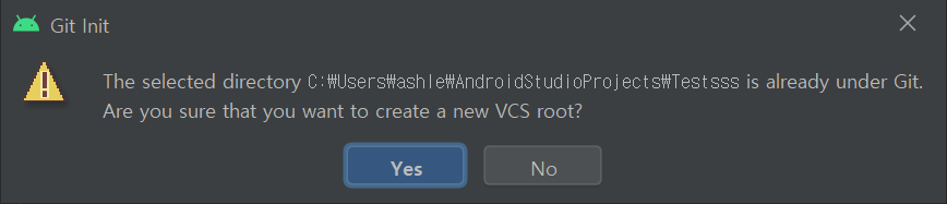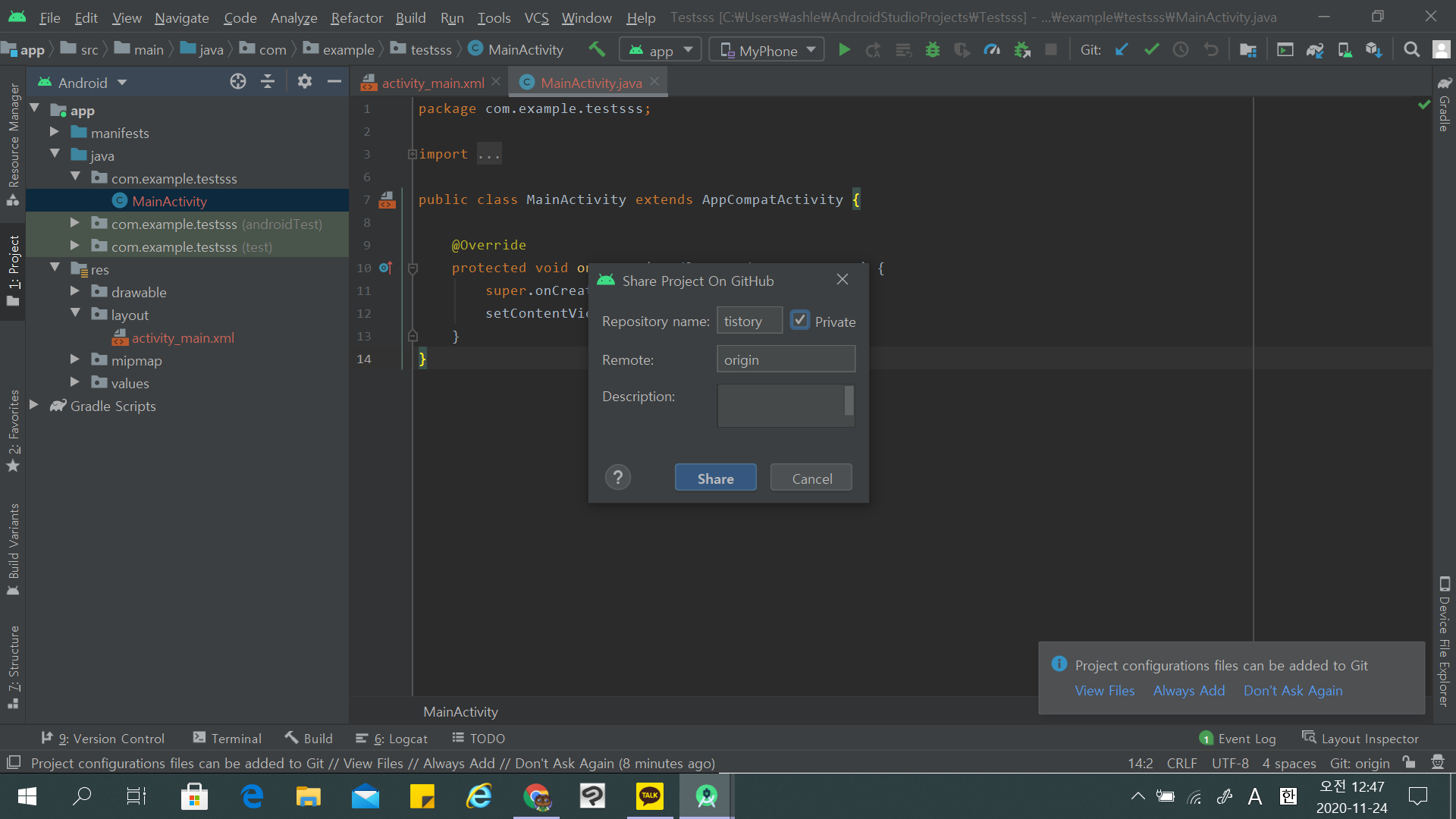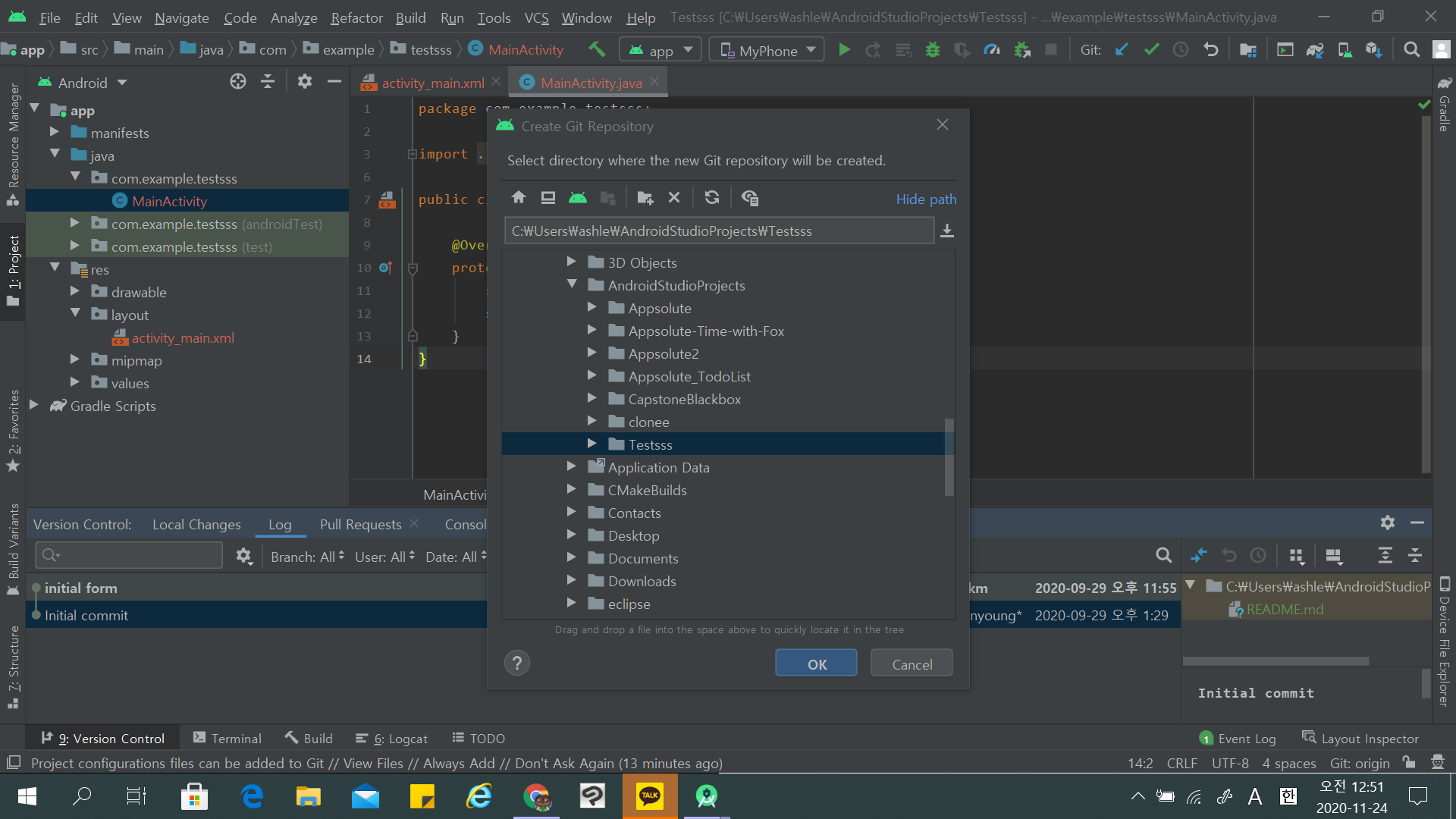 어디에 repository가 만들어질건지 선택가능하다. 공유하고자 하는 프로젝트 파일 밑에 만들어주자. 나는 실수로 androidstudioprojects에다가 만들어서 골치가 아파졌다...